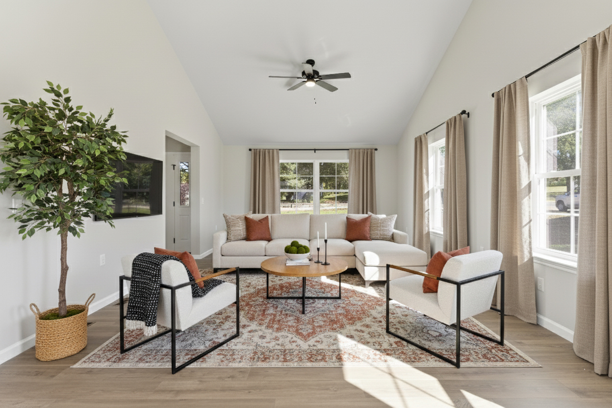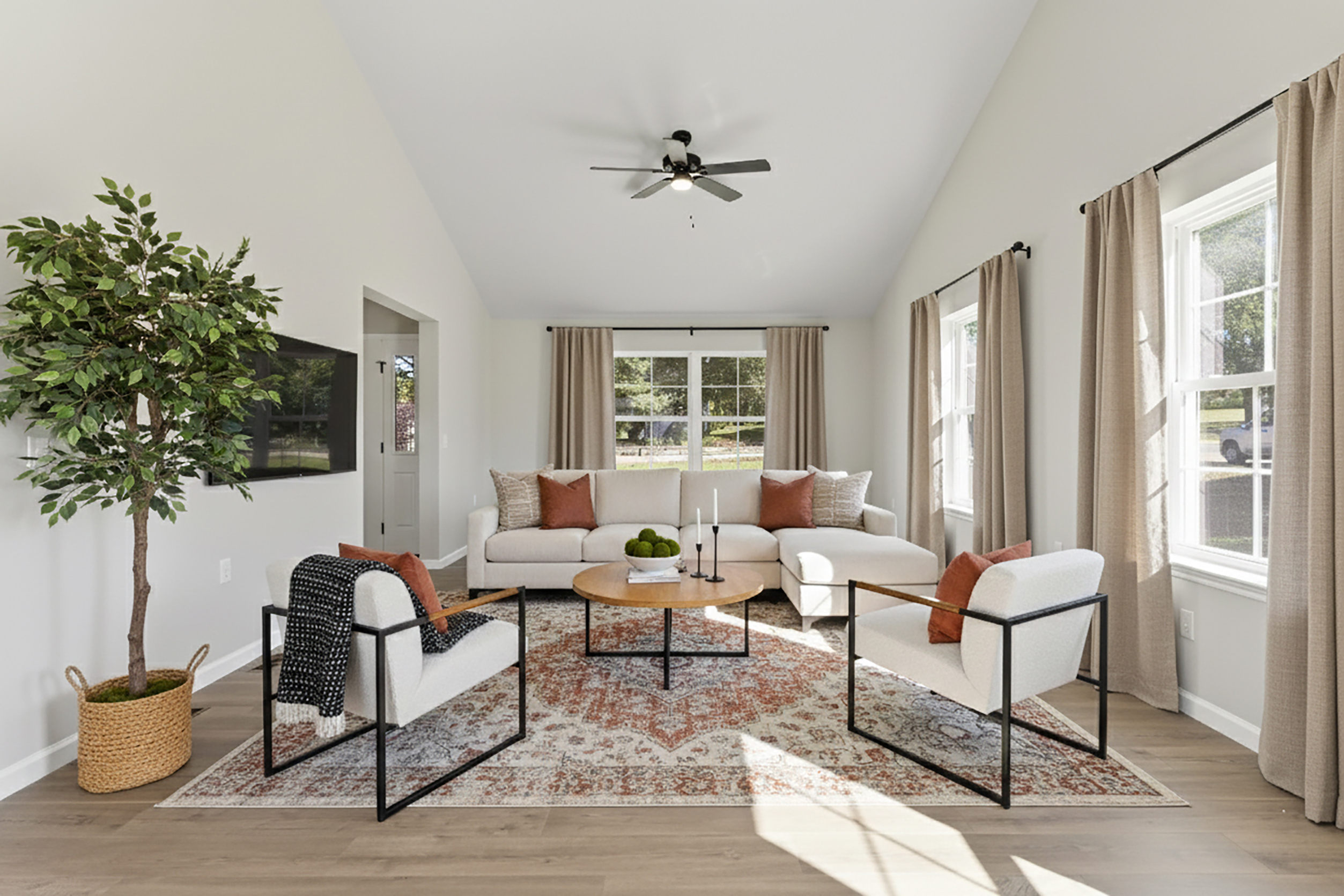 Inside, soaring cathedral ceilings and large windows fill the open-concept living area with natural light. The kitchen features stylish finishes and a functional layout that flows seamlessly into the dining and great room spaces—perfect for everyday living and entertaining. A convenient first-floor bedroom offers flexibility for guests or a home office.
